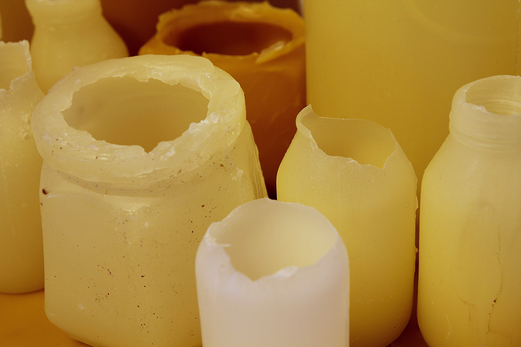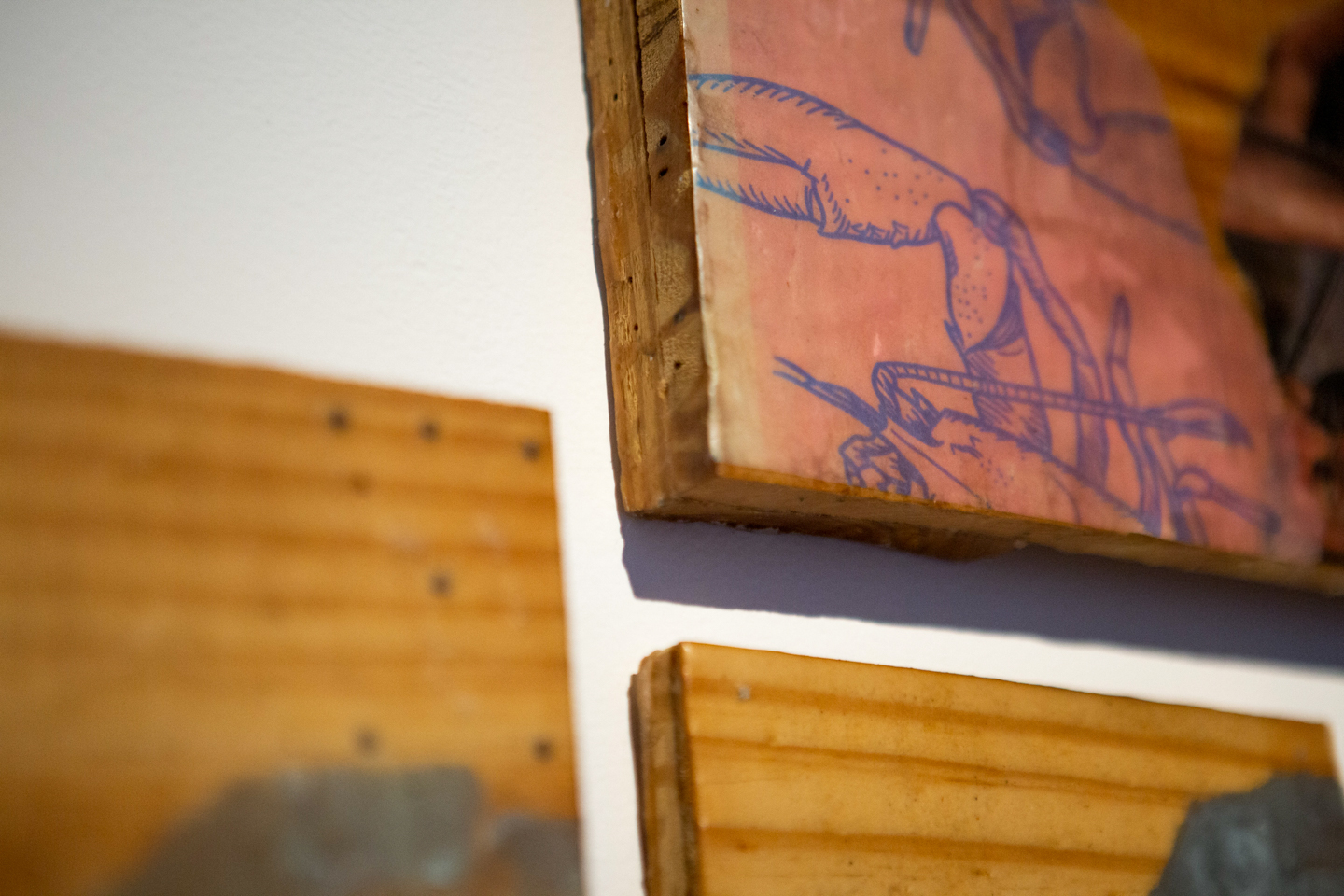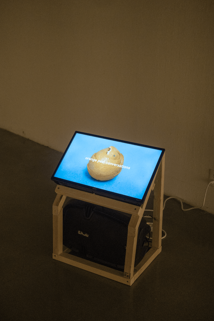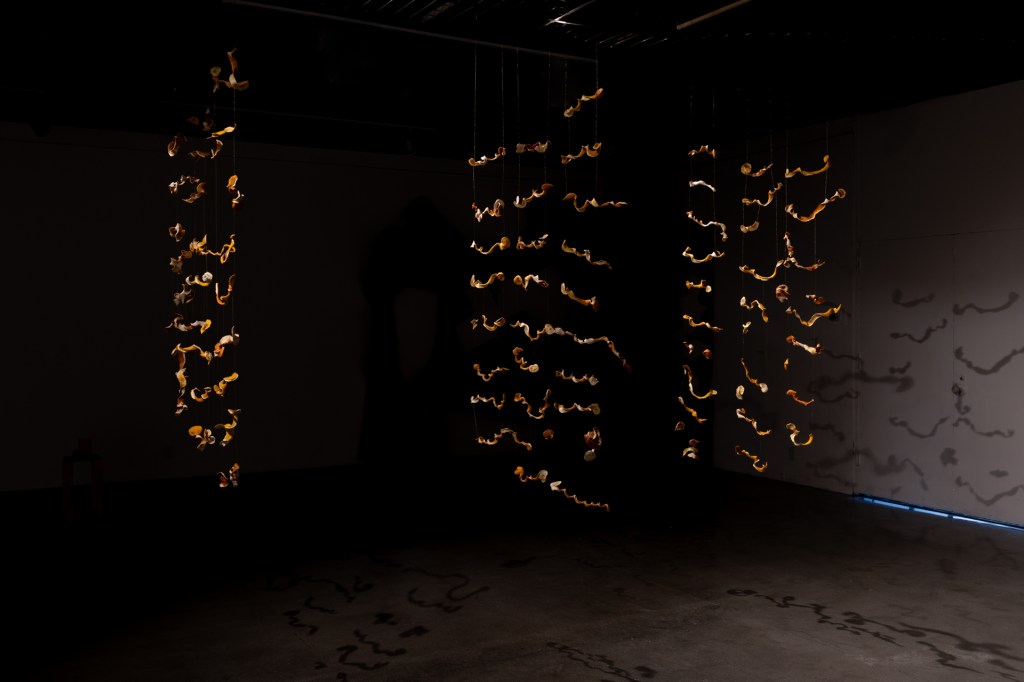 how to peel an orange or invisible acts of care / 2023 / 98 orange peels, golden thread, wood