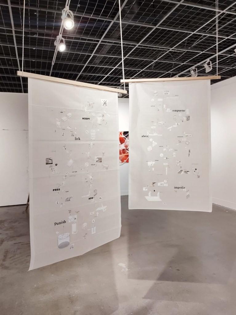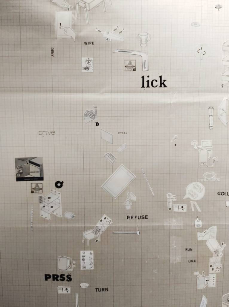 EN | two paper panels with instruction manuals images and letraset with all the verbs in two different translations of the short story (Instruction Manual, by Julio Cortázar)