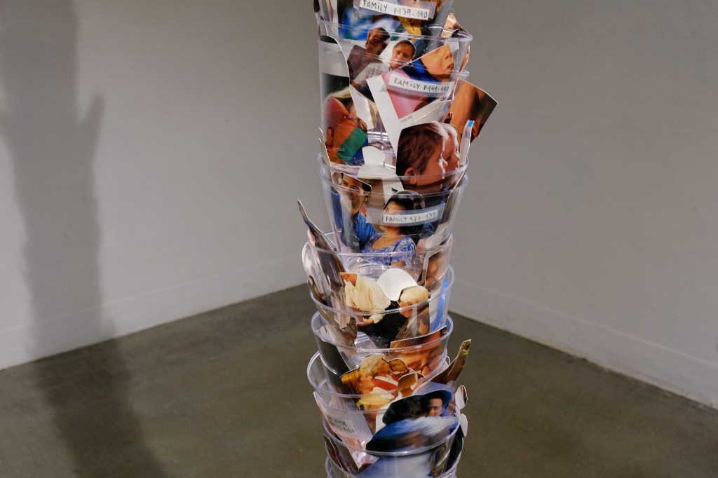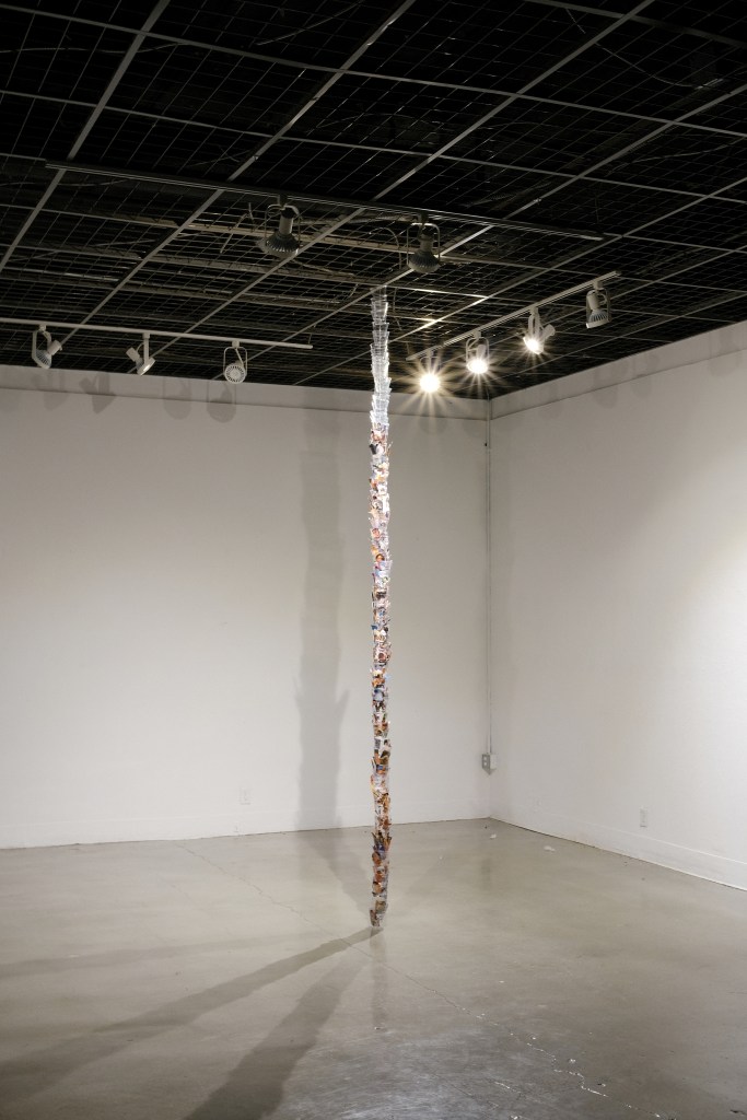 material encontrado (copos, arame, catálogo de fotografias, etiquetas), 5 x 5 x 335cm