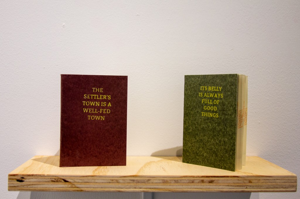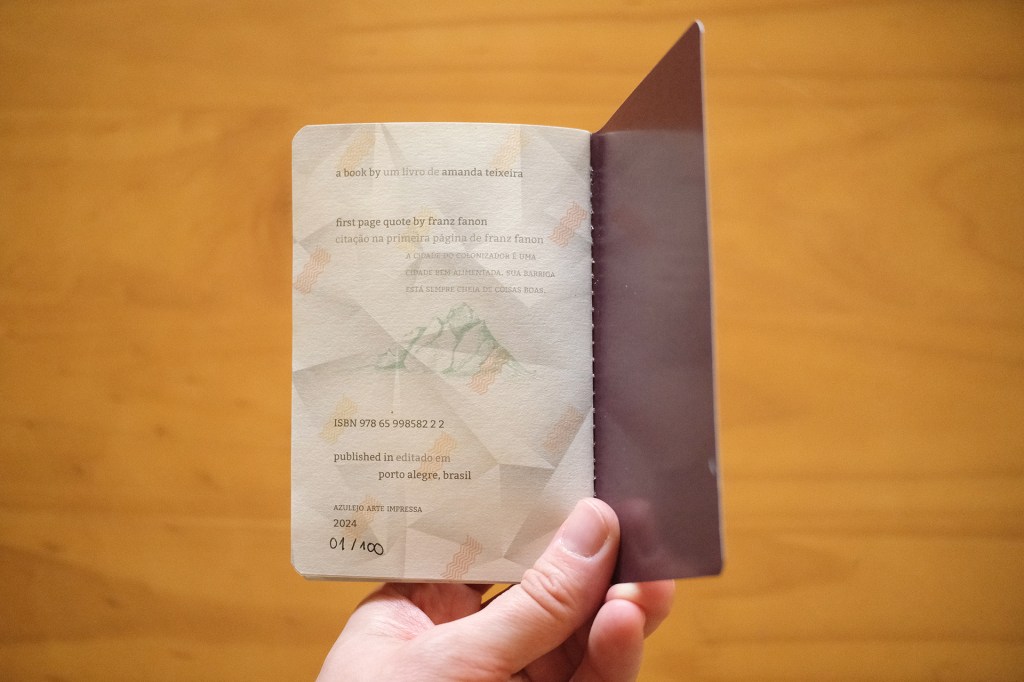 I designed pages with mountains and palm trees, reflecting the landscape I now see every day. I bound these pages together. On the cover, one sentence from Frantz Fanon is split in two: “the settler’s town is a well-fed town / its belly is always full of good things.”